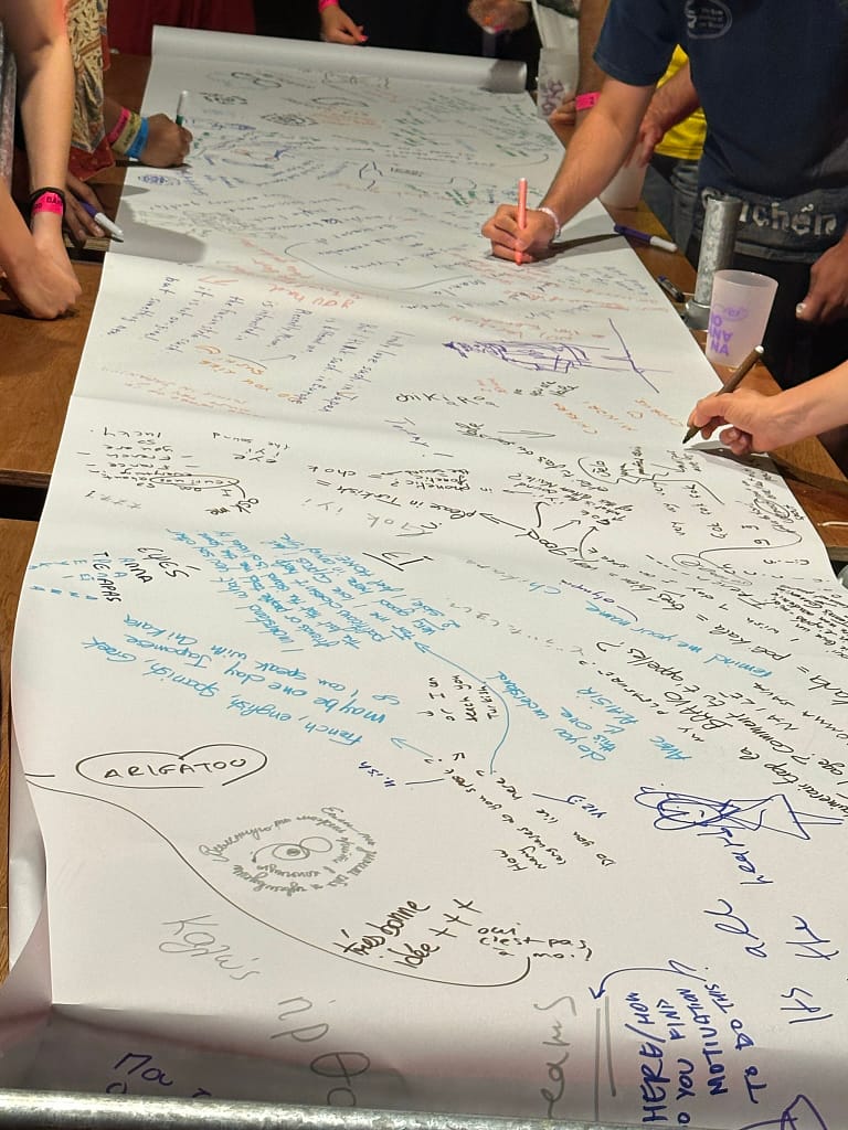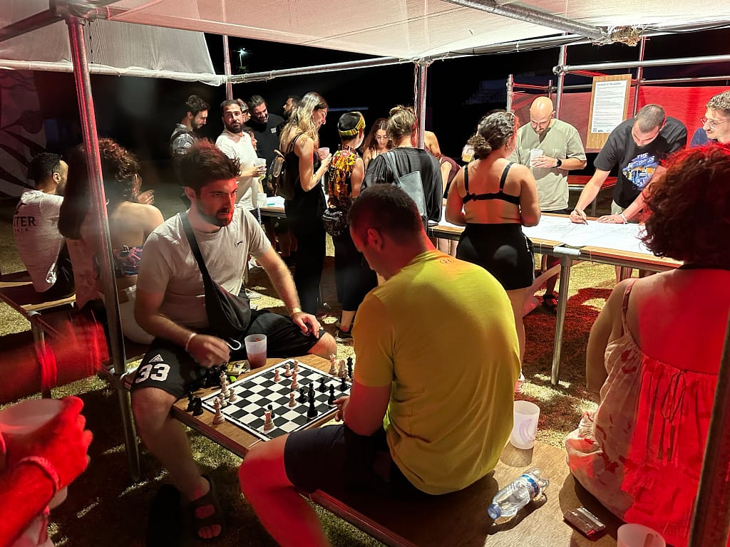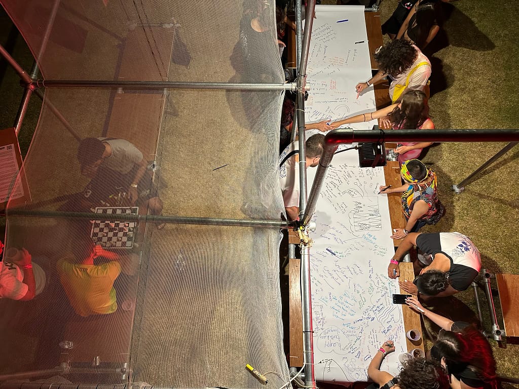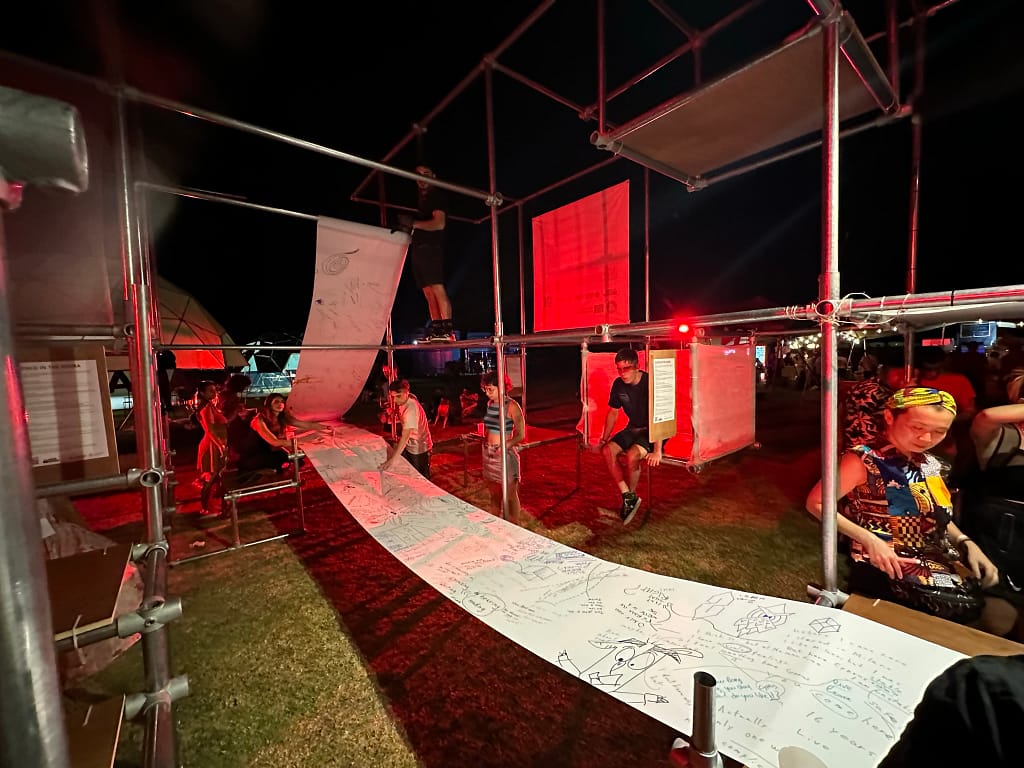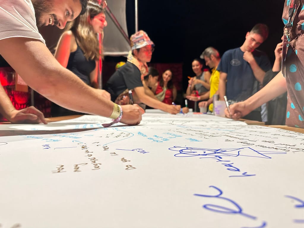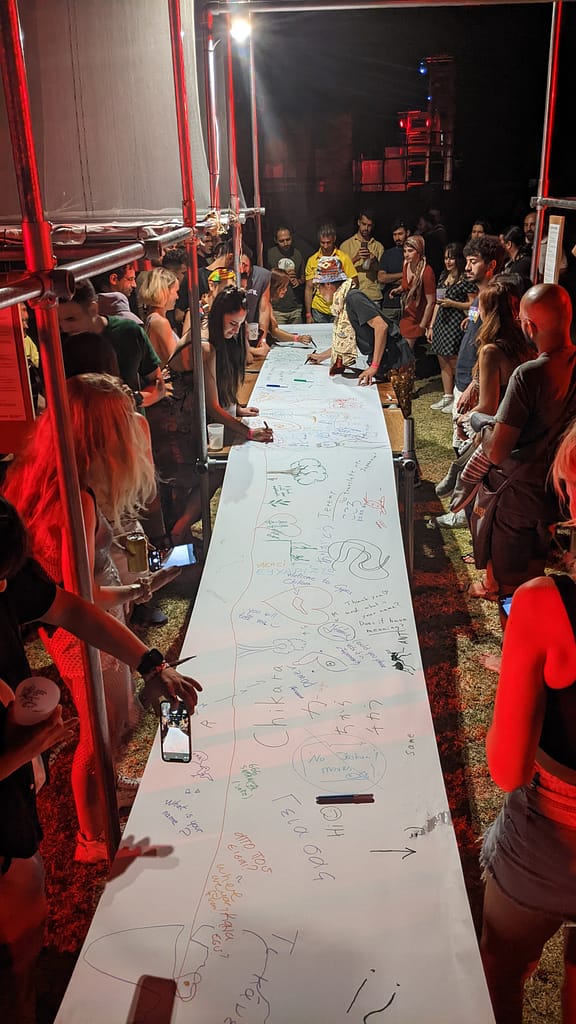 ‘Silence in the Agora’ workshop transformed the Agora into an oasis of non-verbal expression and tranquility. Festival-goers were invited to enter this space in silence, allowing for introspection and spiritual rejuvenation. Participants communicated silently, using boards for written and artistic expressions, fostering connections in a serene environment.