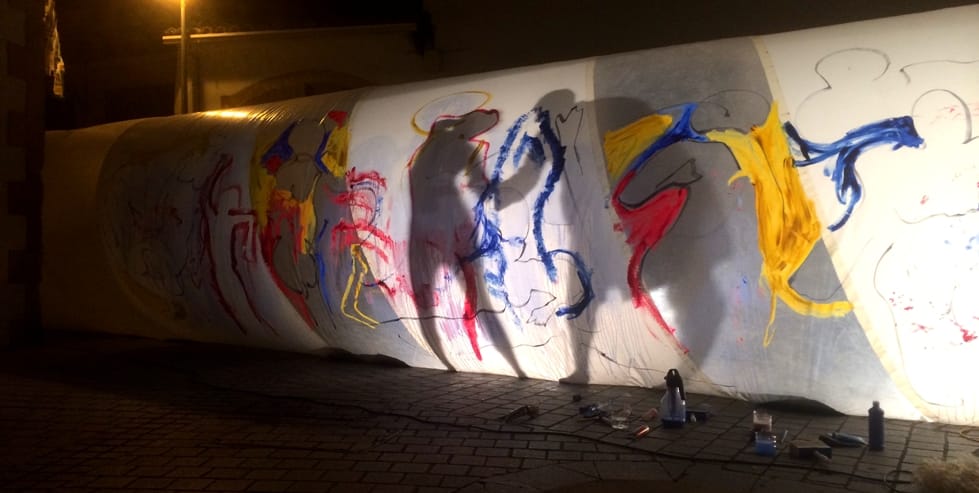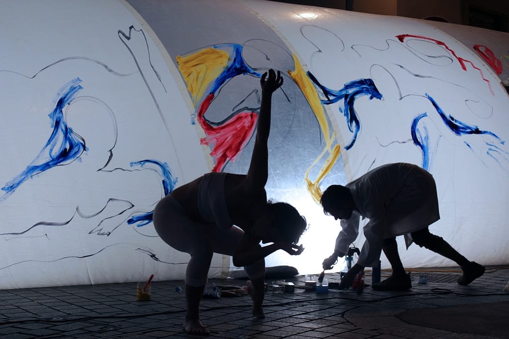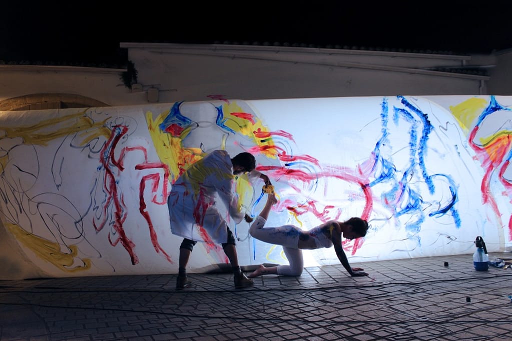 A pair of French performers took us into the anthropometric dimension: Created on a plastic cylindrical volume, a pictural work revealed itself through the story of an encounter between body and paint.