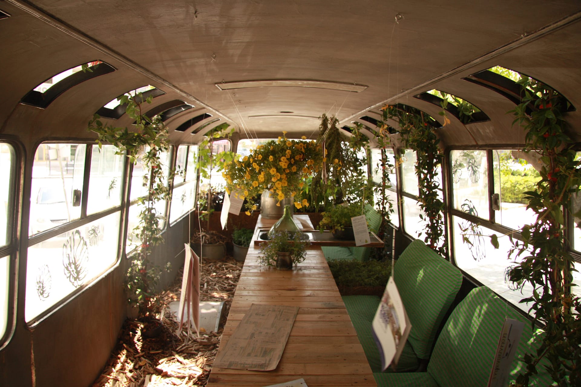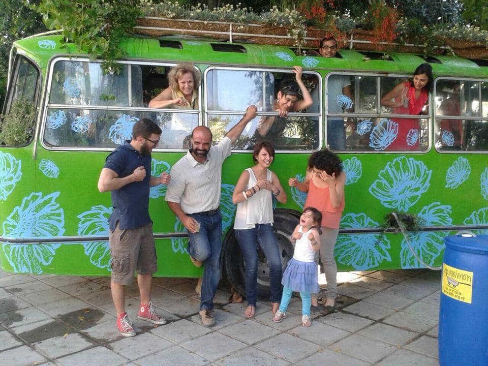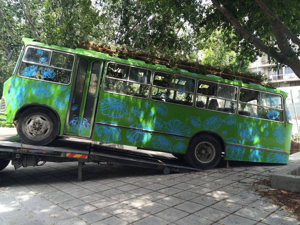 In May 2014 we took a disused bus from the scrap yard and converted it into a temporary urban installation that transformed a pavement area at Ayios Antonios Park, along Stasinou Avenue outside the old walls of Nicosia, into a shaded green space for social interaction among city dwellers. With this project we were able to promote Cypriot artistic work at street level, offer the public a creative use of public space and promote Tiganokinisi, an innovative project turning used cooking oil into biodiesel. The Green Urban Kitchen Bus was an action to raise awareness about the use of public transport and get people thinking about sustainable living, recycling, and growing our own food at home.