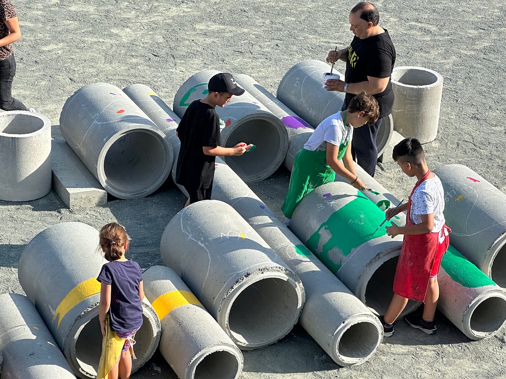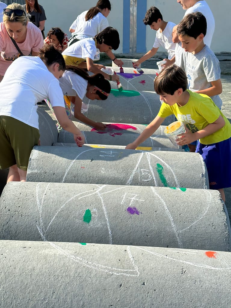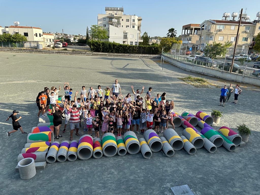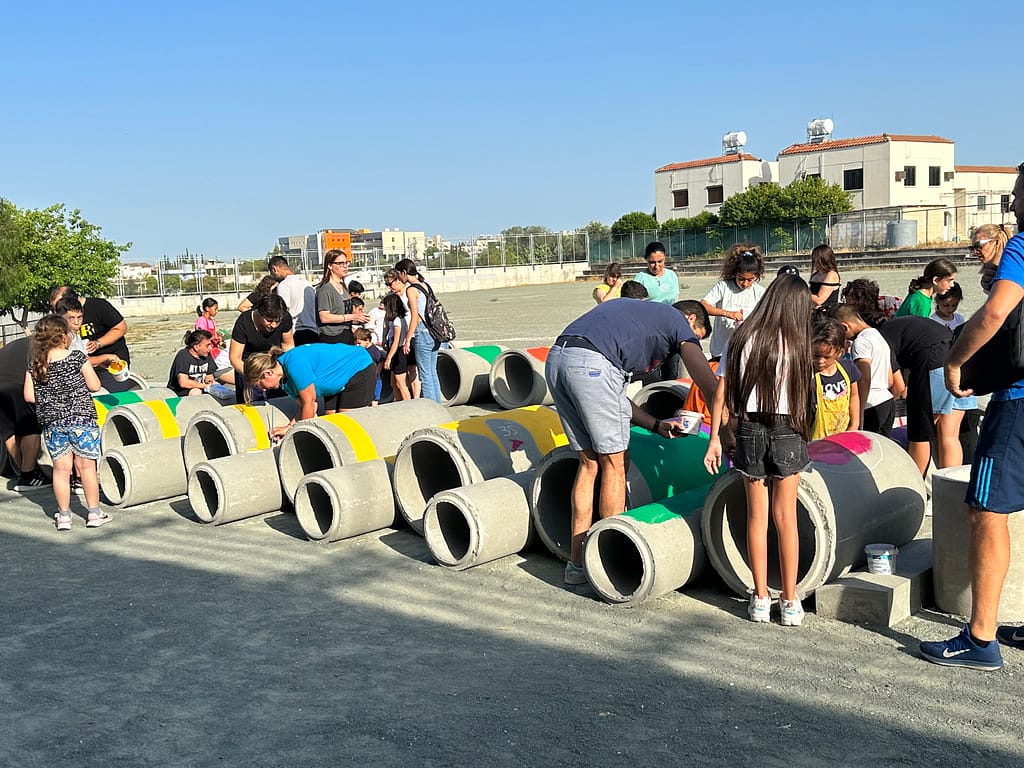 The outcomes of the co-creative sessions were used as inspiration for Urban Gorillas to propose a low-cost design for transforming the schoolyard, which was done through the playful spatial distribution of large concrete tubes. The final event saw the active participation of children, parents, and teachers from the school, who collectively painted the concrete tubes with a vibrant array of colours. This event infused the space with bold and imaginative concepts and exemplified the collaborative spirit that underpinned the workshop on schoolyard design.