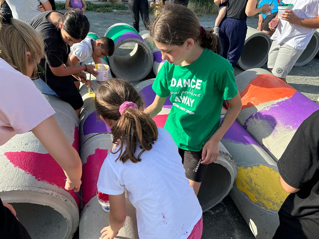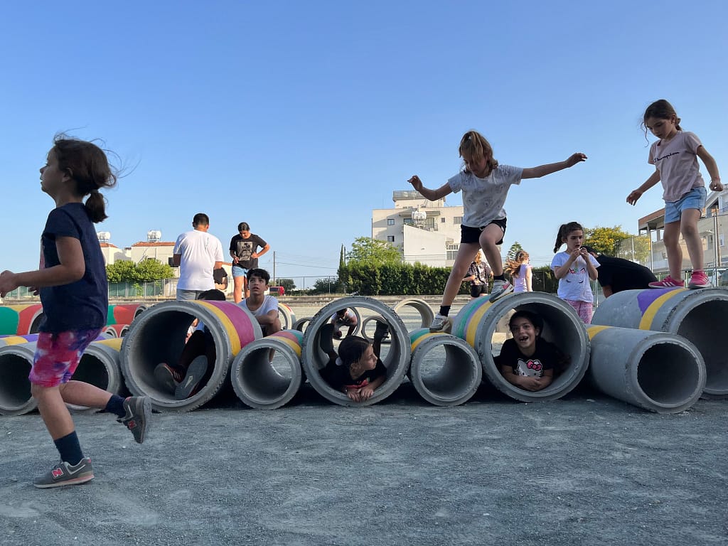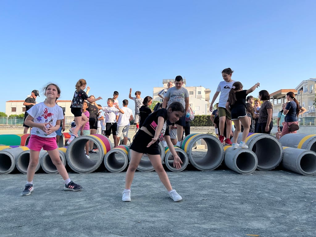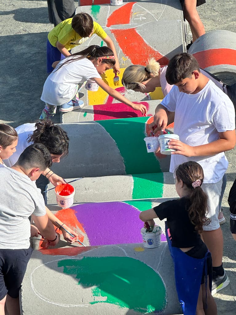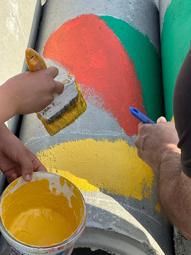 The outcomes of the co-creative sessions were used as inspiration for Urban Gorillas to propose a low-cost design for transforming the schoolyard, which was done through the playful spatial distribution of large concrete tubes. The final event saw the active participation of children, parents, and teachers from the school, who collectively painted the concrete tubes with a vibrant array of colours. This event infused the space with bold and imaginative concepts and exemplified the collaborative spirit that underpinned the workshop on schoolyard design.