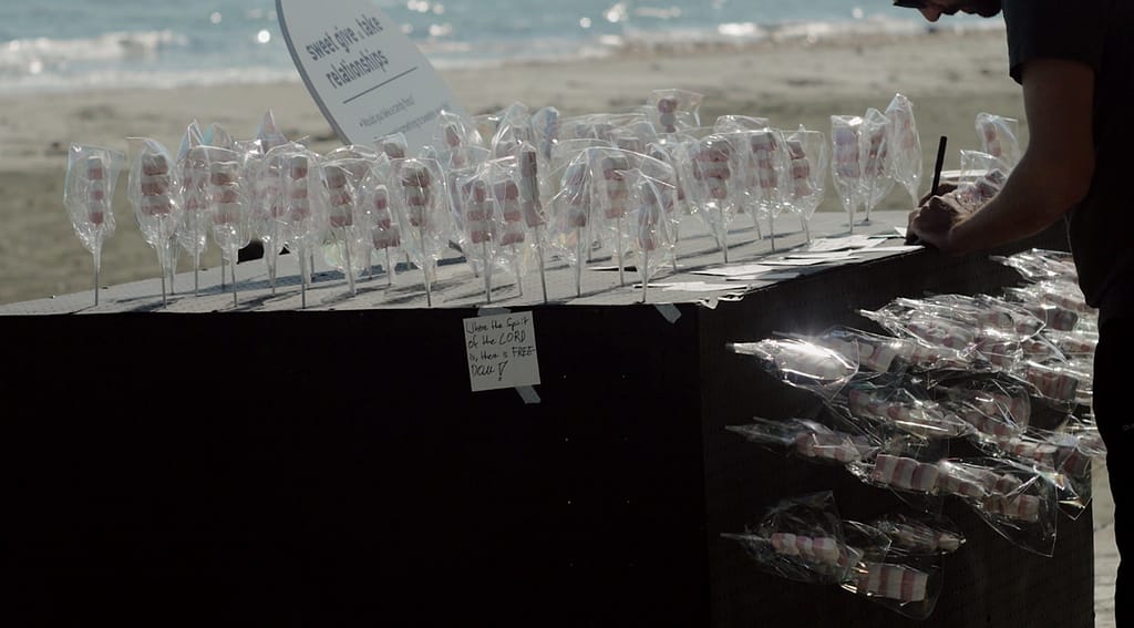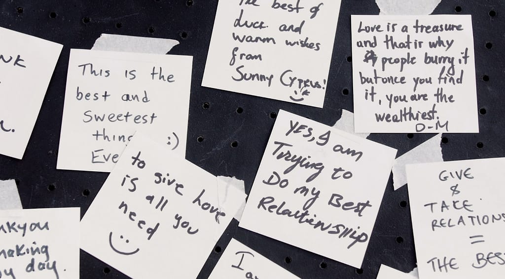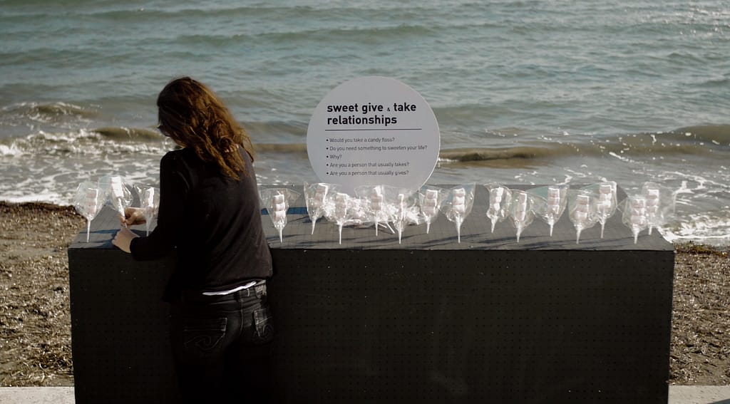 A black box placed in a public environment with marshmallow sticks waiting to be taken and a stack of notes ready to be written. The artist of this installation wants to witness and narrate how a pass-er-by would be intrigued enough to stop and see what the installation is about and what it represents. Once the concept was understood, whether or not they would inter-act by either taking candy, replacing it with a message or simply dis-missing it. What is interesting is how the reaction of each individual also leaves behind a small part of their personality… something of their character.