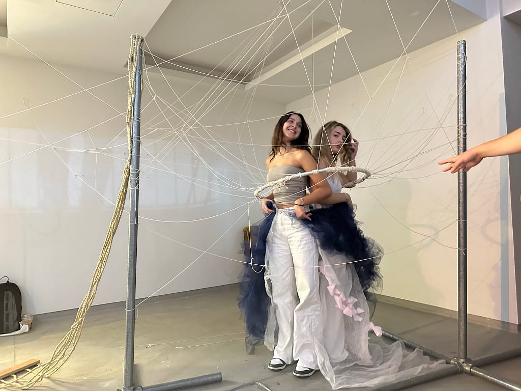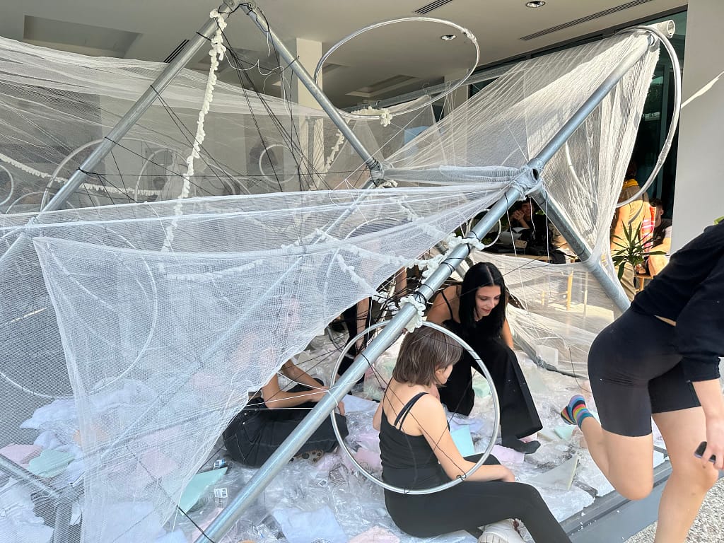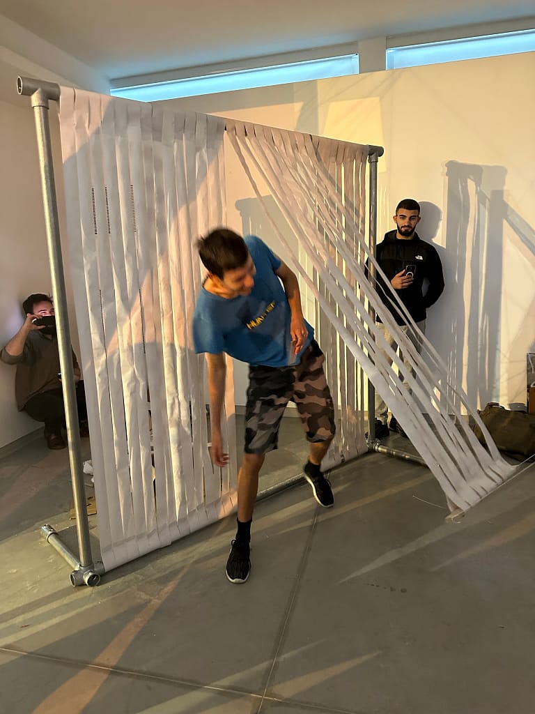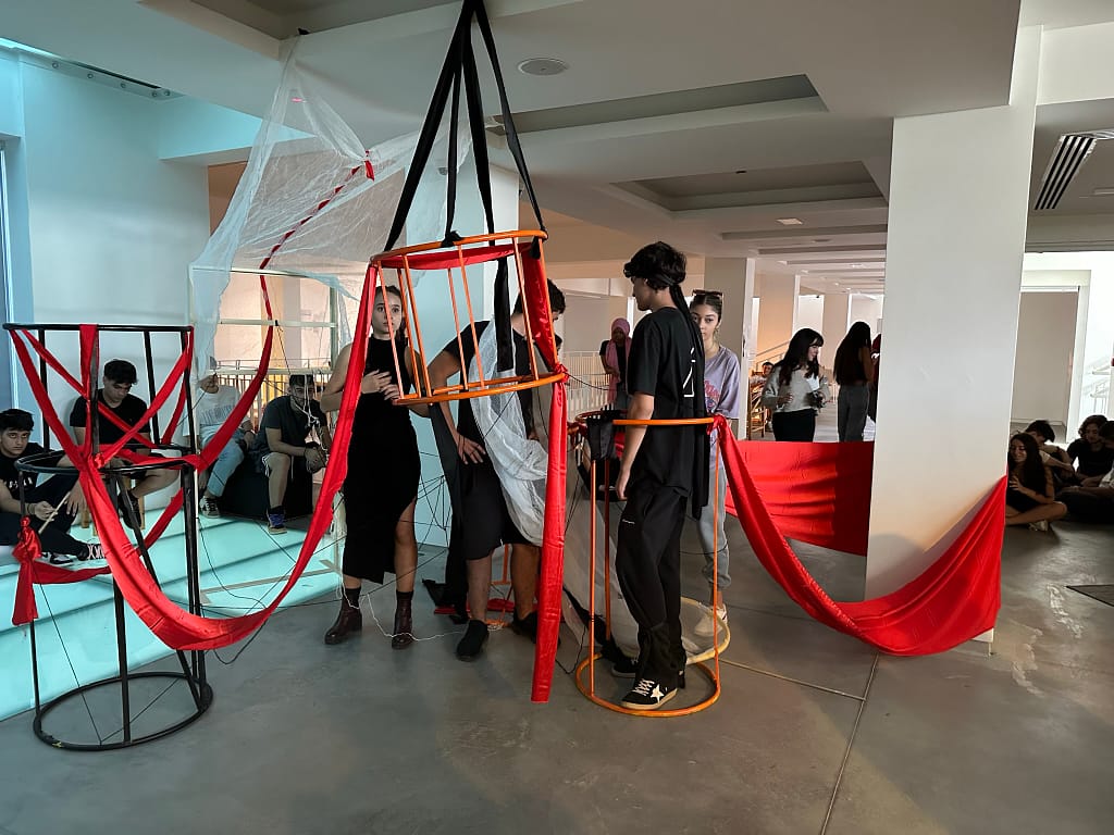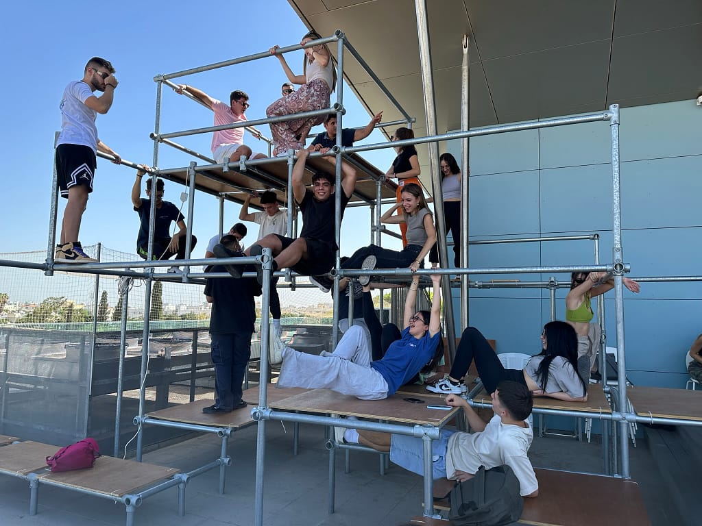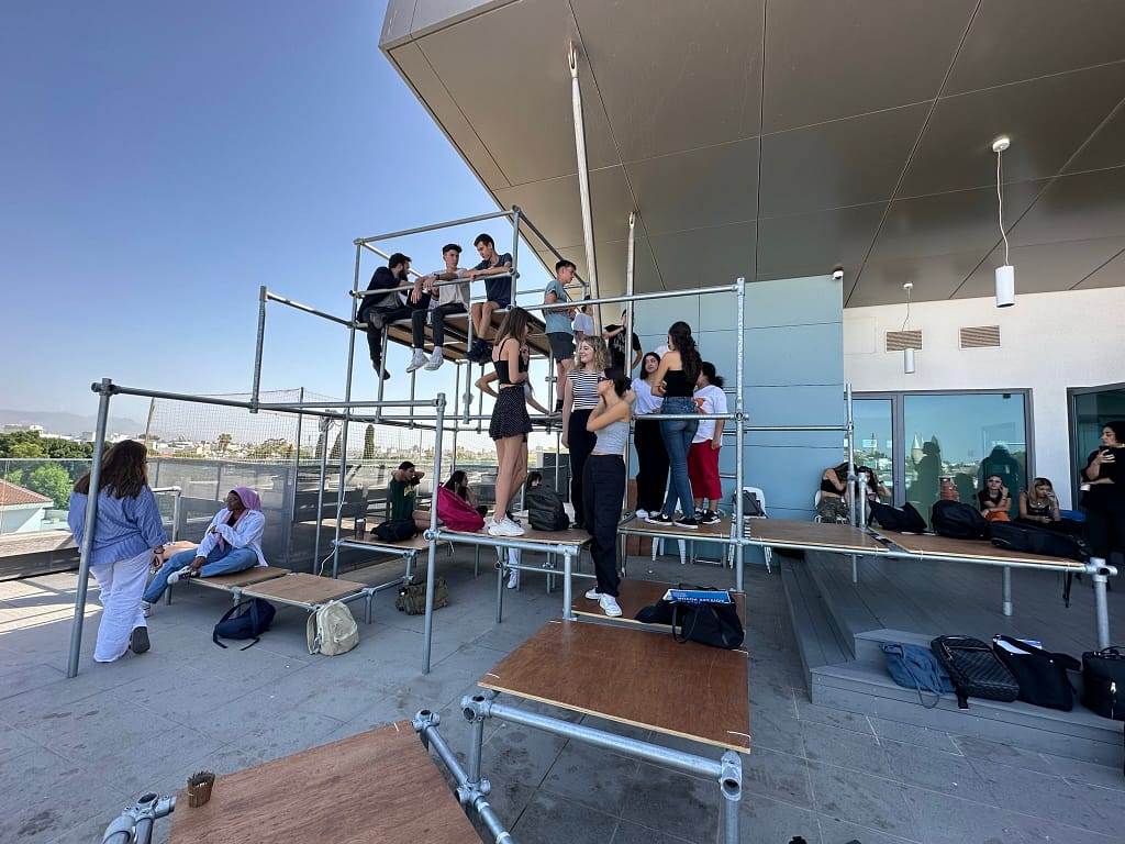 Charis Iacovou’s workshop focused on the relationship between body, space, and architectural elements. Demetris Chimonas and Lex Gregoriou presented their innovative approach to reimagining interior spaces for diverse communities. The students continued their investigations into the potential of the AGORA, a mobile structure designed by the NGO Urban Gorillas with the support of the Commonwealth Foundation and the JEC World Commemorative Fund. Currently located at the Sessions x SPEL at the Cloud, it forms part of a project under the European Creative Rooftop Network, which highlights the interplay of architecture and social dynamics.
