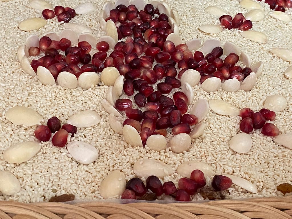 Kollyva is a dish made liturgically in the Eastern Orthodox Church and offered in the memory of the dead. There are different versions of the kollyva recipe but the principal ingredients is boiled wheat kernels, sesame seeds, almonds, ground walnuts, cinnamon, sugar, pomegranate seeds, raisins, and anise. The kollyva are offered in honour of the deceased after Sunday’s mass amongst those attending, and also distributed to relatives or friends of the deceased.