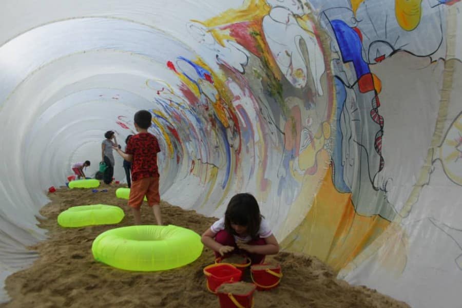 Urban Gorillas’ DNA inflatable structure made in collaboration with Plastique Fantastique and many amazing people from the workshop Inflating the Public_2 featured as a temporary urban playful social space on 24 May 2015 at Festival NEON curated by ABR Alternative Brains Rule. A live art project was created by Mathieu Devavry and Baroque Rococo who painted the inflatable structure. Inside the structure we installed a sandy beach play area. The structure was home to Pecha Kucha presentations, children’s play, picnics, relaxation and artists’ live work performance. Urban Gorillas were proud to be part of this successful event that reached out to youth and the wider community, while making great use of public space at the Nicosia Municipal Gardens. A big thank you for the organisers and all who took part in the day’s happenings!