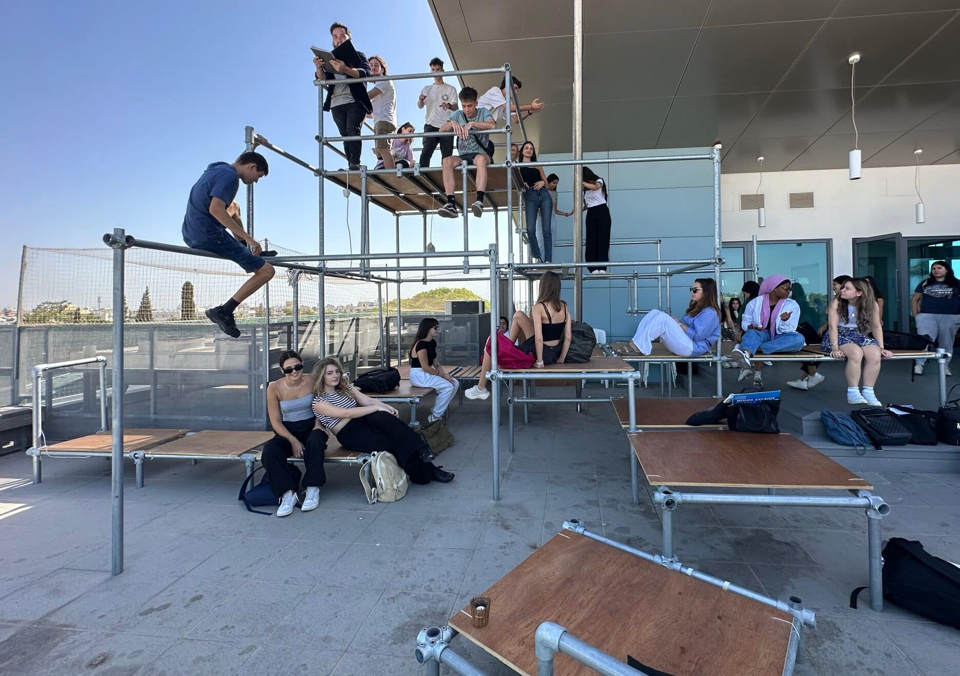 Charis Iacovou’s workshop focused on the relationship between body, space, and architectural elements. Demetris Chimonas and Lex Gregoriou presented their innovative approach to reimagining interior spaces for diverse communities. The students continued their investigations into the potential of the AGORA, a mobile structure designed by the NGO Urban Gorillas with the support of the Commonwealth Foundation and the JEC World Commemorative Fund. Currently located at the Sessions x SPEL at the Cloud, it forms part of a project under the European Creative Rooftop Network, which highlights the interplay of architecture and social dynamics.